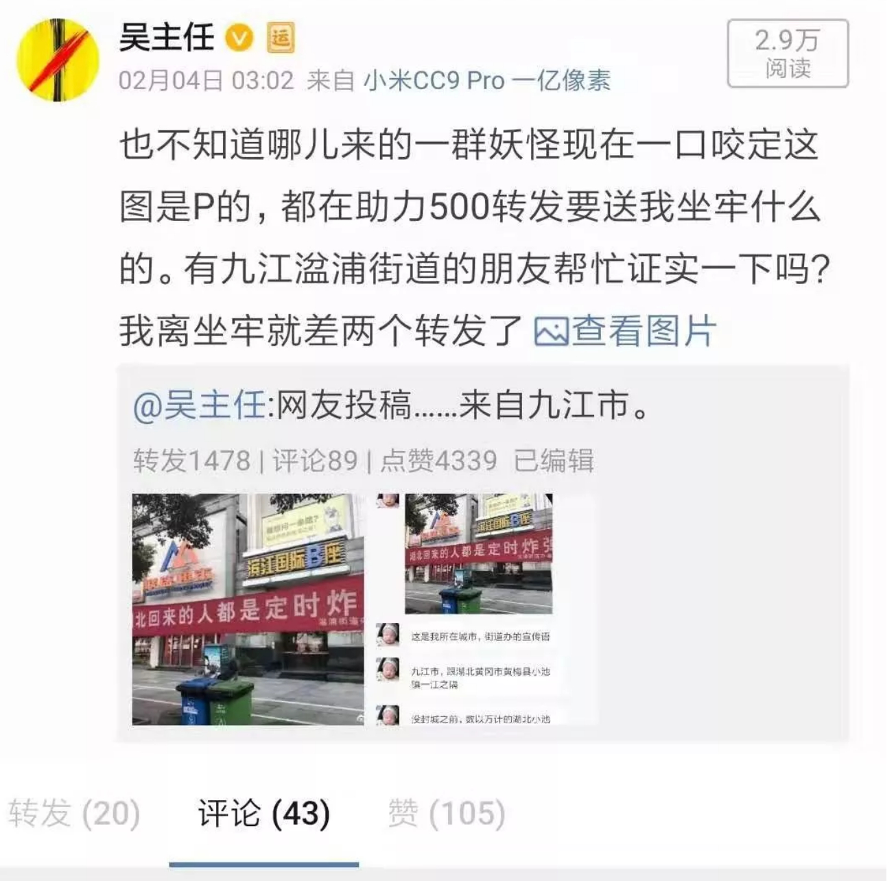 电话拨通了。现在能接陌生号码的人不多了,也不怕我是个骗子,可见这位读者为人朴实憨厚。我说,你好,我是吴主任,你昨晚给我提供的那个标语是不是你拍的?能否给我原图。对方愣了一下说,哦,你好,不是我拍的,但昨天我们生活在这里的湖北人都在传,我是住在九江的湖北人,这图肯定是真的,我们很多群都在传。