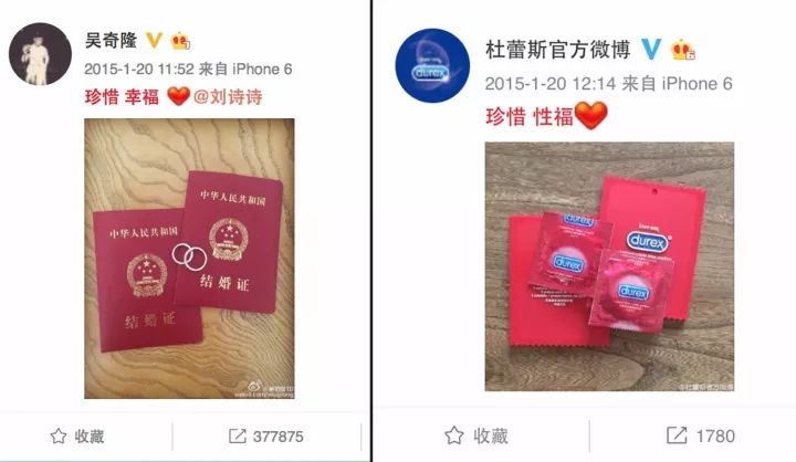 12 点 10 分左右,环时互动第一事业部杜蕾斯组的同事,在微博上看到了这个消息。11分,创作团队开会,确定创意方向;13分,找到类似结婚证的杜蕾斯礼品,在和原图类似的木桌上完成拍摄,并讨论文案;14分,发出微博,配文"珍惜,性福"。