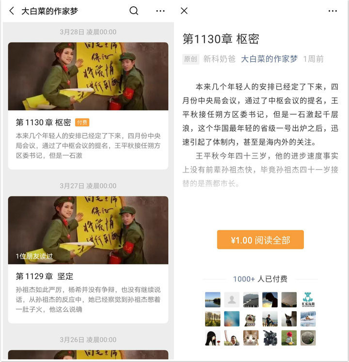 对此乔恒表示很无奈,因为公众号暂时不支持自定义价格,付费定价最低为.1.元,因此一次.3.元的价格的不是针对一篇文章,实际的意义是对一周连载小说更新的付费。为了吸引读者付费,乔恒会选择关键的情节点作为付费章节。