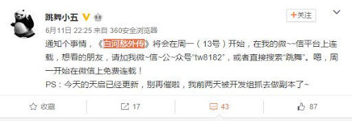 ▲起点中文网白金大神作家跳舞也曾在公众号连载小说.