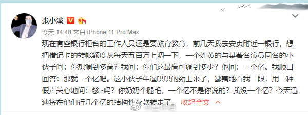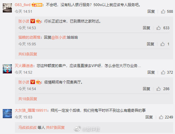 @差评君:#被银行员工冷落取走数亿存款# 凤凰联动董事长张小波把借记卡的转帐额度从每天五百万上调一下,按照他的描述,柜员阴阳怪气的,他一怒之下把在该行的几个亿结构性存款转走了。现在行长都赶过去了,蹲个后续。网友评论“拜托一定发个后续,我们穷鬼平时听不到这么有趣奇异的事”,这句笑死我了