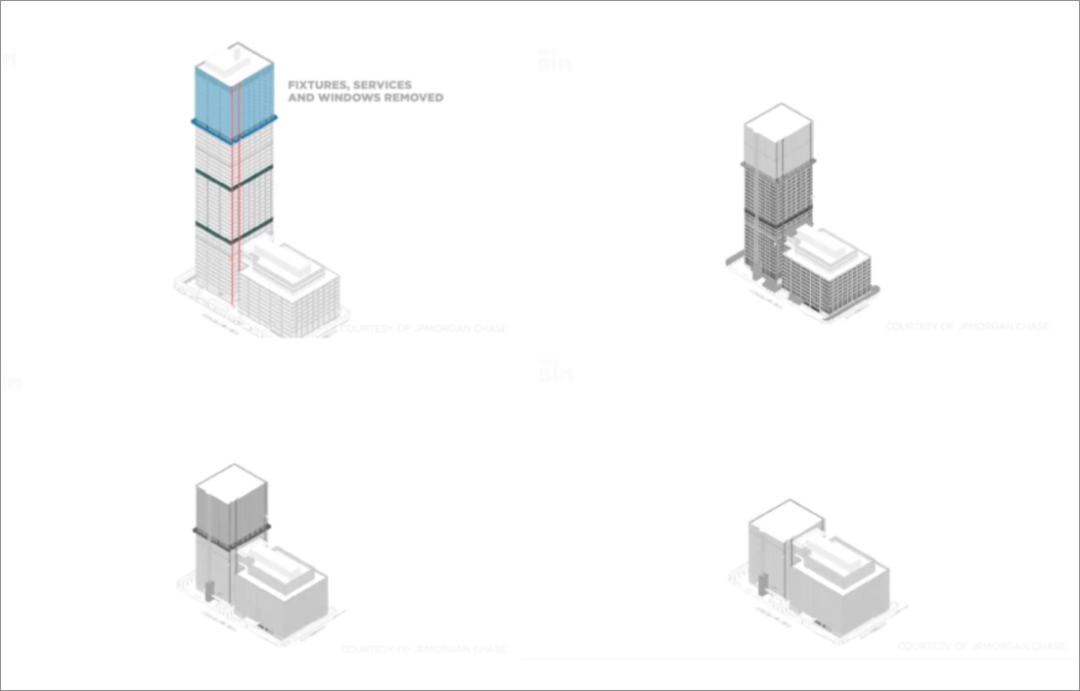 公园大道.270.号的拆除过程,就像是把建造过程反过来一样:在清除有害物质之后,工人们在大楼外部搭好脚手架和围网,再将里面的建筑材料拆除并运走。