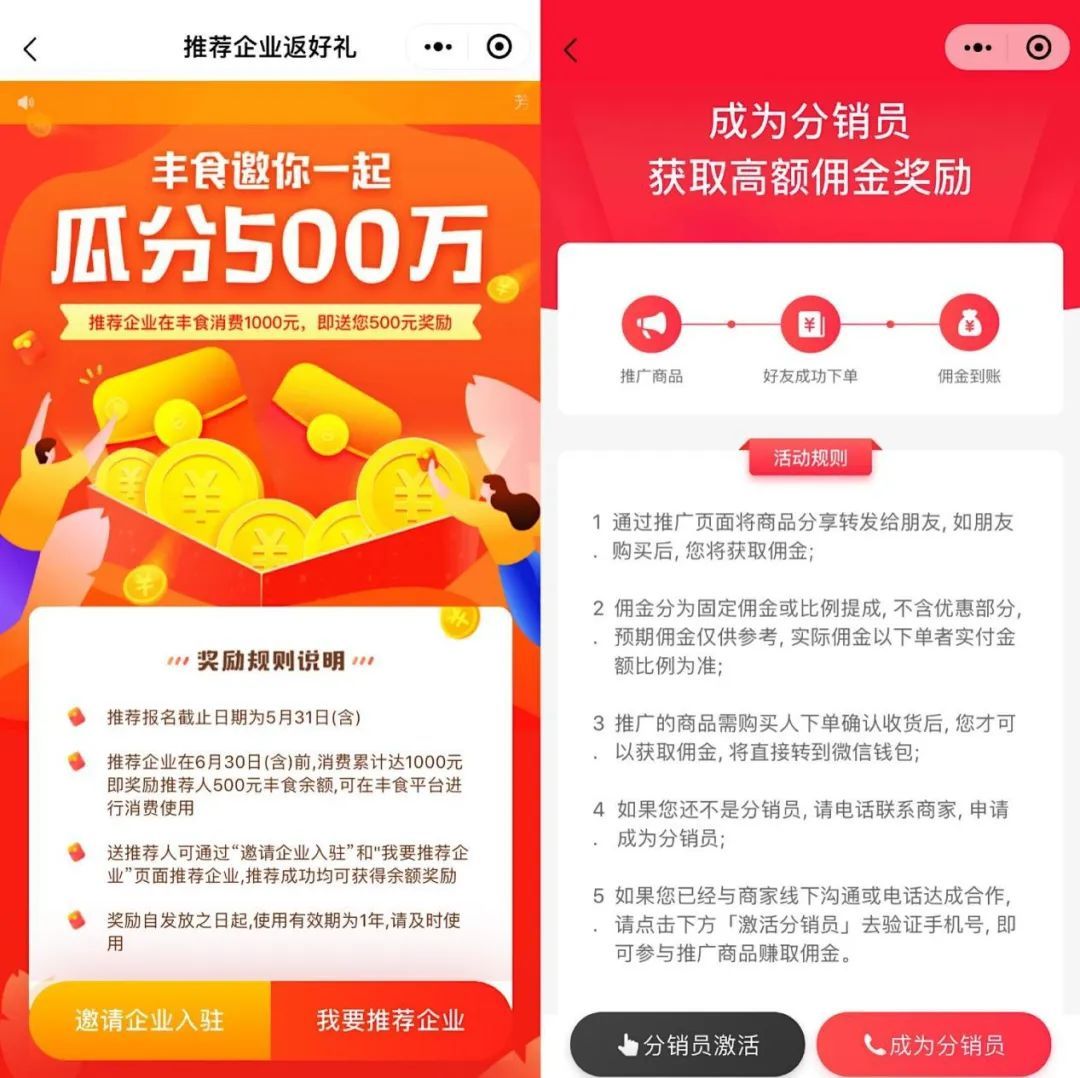 先抢商家,再抢用户,顺丰甚至玩起了“补贴价格战”的游戏。丰食推出了“瓜分500万”的活动,用户可通过“邀请企业入驻”和“我要推荐企业”页面推荐企业。奖励十分诱人——企业成功入驻后,推荐人将获取1元奖励。而推荐的企业6月30日前在丰食消费1000元,推荐人还可另外获得500元奖励。