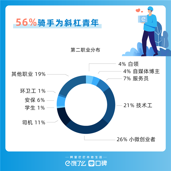 《2020饿了么蓝骑士报告》显示,在外卖配送工作之外,外卖小哥普遍拥有多重人生,56%都是"斜杠青年"。