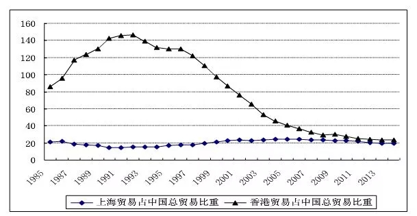 港口贸易直接遭到了内地的一堆口岸的竞争,比如深圳,广州,上海等等。大家看看这个图,可以看出这种比重在逐年下降: