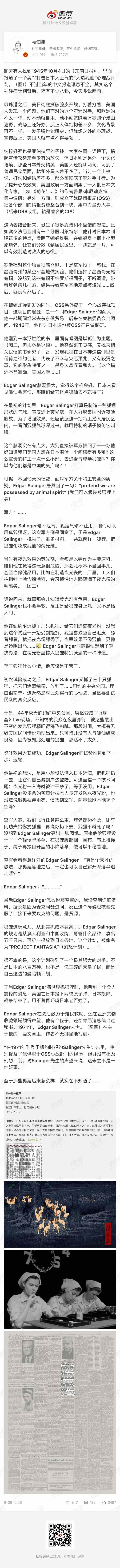 @马伯庸:昨天有人找到1945年10月4日的《东南日报》,里面报道了一个美军打击日本人士气的“人造狐仙”心理战计划。不过当年的中文报道讯息不全,其实这个神经病计划背后,还有不少八卦。