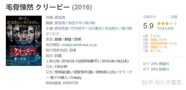 但其实我还挺喜欢《毛骨悚然》这部电影的,它在黑泽清的作品序列里确实不算一流,但从豆瓣和知乎评分来看还是明显地被低估了--我也是因为这个原因,一直拖到最近才看。