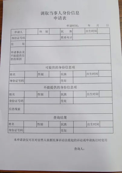 律师可以填写附图的表,请法庭协助调查。很快,你就能知道他或者她叫什么、身份证号码、身份证上的地址(很重要)了。