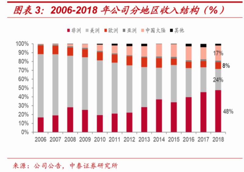 瑞贝卡从2003年挂牌上市成为国内发制品第一股后,走出中国走向世界,目前拥有国内、尼日利亚、加纳、柬埔寨四大生产基地,销售网络覆盖欧美、非洲、亚洲地区。公司外销收入占比达到八成左右,其中主要的出口地为非洲和美洲,收入占比分别为四成和两成左右,而内销占比不到两成。