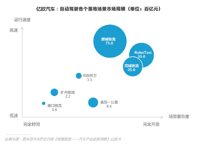 据蔚来资本测算,自动驾驶在智慧城市、物流、公共出行等方面具有广阔的发展前景,而它在跨城物流、RoboTaxi和同城物流等方面更是分别达到7000亿元、3500亿元、2500亿元的市场规模。