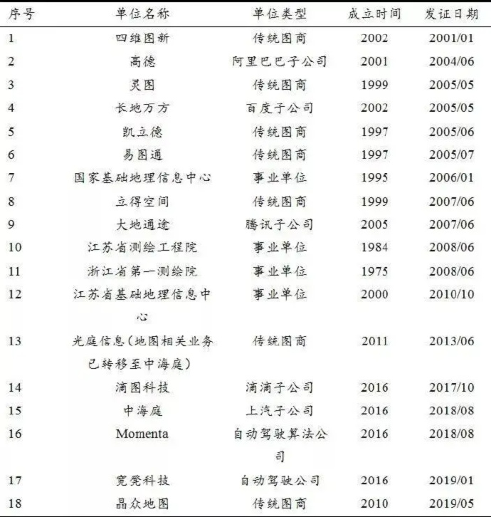 从2001国内第一家企业四维图新获得地图甲级测绘资质,到2019年底,全国仅有18加企业取得资质。而这其中,真正拥有完整的地图制作能力的公司又只有5家。
