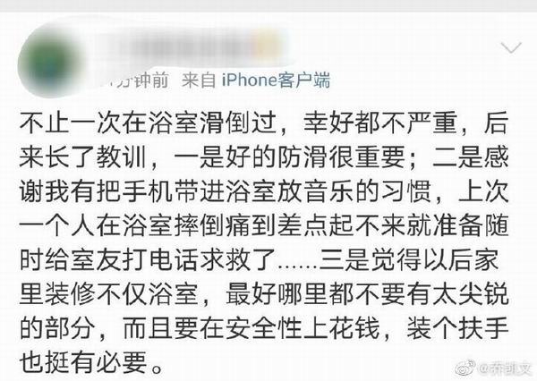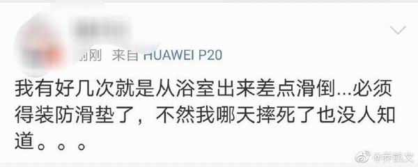 @乔凯文:稍微搜一下,就知道有多少人在浴室滑倒过了,所以一定要注意穿拖鞋,装防滑垫。独居人士更要注意。