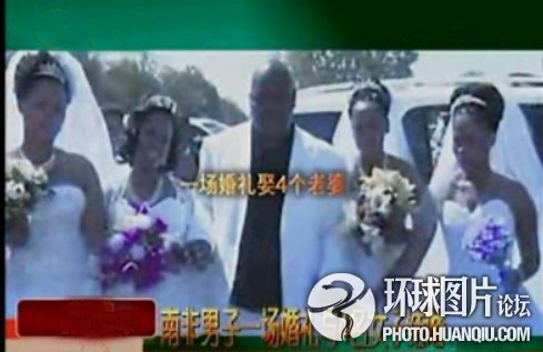 2009年9月27日,南非一名男子与4名女子在同一场婚礼上结为夫妇。尽管当地认同一夫多妻制,这场婚礼仍属罕见。南非夸祖鲁纳塔尔省时年44岁居民米尔顿 莫西利身穿白色亚麻礼服,与4名身穿白色婚纱的女子搭乘同一辆豪华轿车前往当地一家运动场举行婚礼。一座大型帐篷内,莫西利对新娘们许下婚誓。而4个新娘如花似玉,年龄从22岁到35岁不等,则一排溜地站在新郎面前,同时回答了“我愿意”,每人都得到一枚结婚戒指,并轮流被新郎莫西利亲吻了一下。莫西利说,自己对每名妻子爱意相同,而妻子们之间则存在“良性竞争”,4个妻子都拥有各自的住宅,不会生活在同一个屋檐下。婚后莫西利将像“值日”一样轮流和每个妻子生活一段时间。