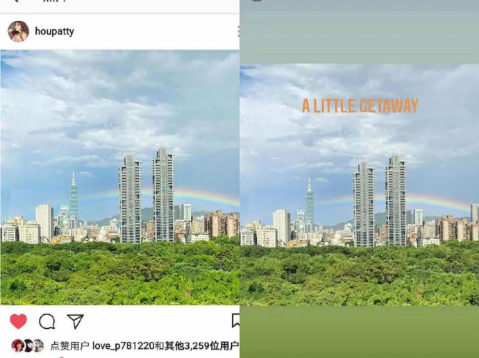 然而事实并非如此,这张照片的真正作者是侯佩岑,早在今年七月份,侯佩岑在社交网站上就放出了同款彩虹照片,不仅拍摄地一样,视角一样,就连彩虹也是那一条彩虹,这是不是很奇怪?