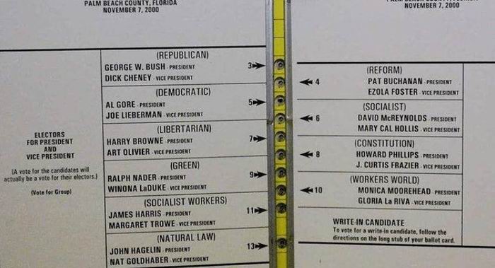 中间那一排孔,选谁就用笔或什么东西把那个孔打穿,.之所以叫"蝴蝶",是因为候选人名字是错开印的,大家注意看,第一个孔是共和党布什,但第二个并不是戈尔,而是右边的Pat.Buchanan,老年人眼花手抖,很容易想当然的以为第二个孔是戈尔(第一个肯定不会错)。