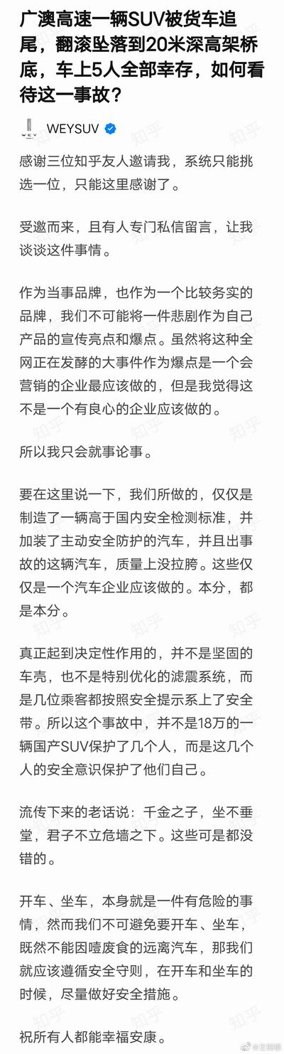 今天最让我意外的是长城官方在逼乎就这起事故发了个答案,我本以为他们是借机发烂广告,仔细一读特别感动。在消费者对汽车安全性的认知普遍很幼稚的时候不去占这波便宜而是发表客观科学的评价,难能可贵。没有错,通过一场事故判断一个车安全性是不可能的,控制变量法初中就学了,不同的事故中可能有几十上百个不同的变量,就别信口雌黄了。