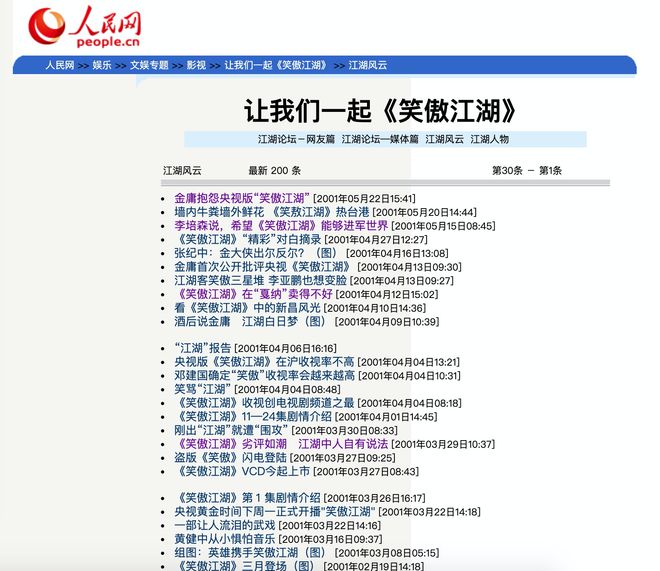 这些翻拍在2001年左右结束。也是2001年,大陆第一部金庸小说改编的电视剧《笑傲江湖》上线。这是当年的文娱界大事。为此,人民网还出了专题页: