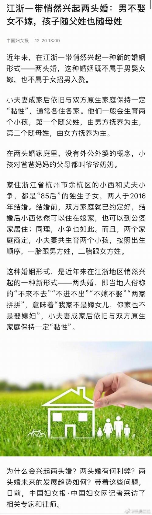 媒体报道江浙一带兴起的“两头婚”,当地俗称“不来不去”“不进不出”“不嫁不娶”“两家拼拼”,主要形式是:婚前双方家庭约定,婚后夫妻双方可以“各住各家”;生两个孩子,按照出生顺序,一个随父姓,由男方抚养为主。一个随母姓,由女方抚养为主。