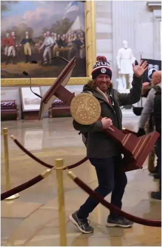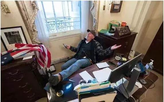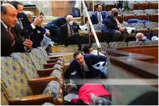 从美国四面八方赶来"勤王"的那些特朗普粉丝,疯狂地冲进了国会大厦。国会立即休会,议员们纷纷躲到桌椅下面,彭斯则直接通过地下隧道撤离。有抗议者高坐在众议长佩洛西的办公椅上,而佩洛西因为逃得匆忙连电脑屏幕都还没来得及关上……