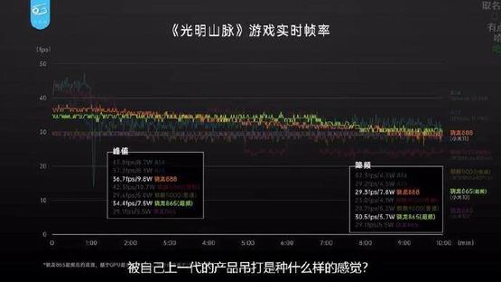 在游戏《光明山脉》中,骁龙888的帧率和功耗表现均不及超频后的骁龙865。来源:“极客湾”B站视频截图