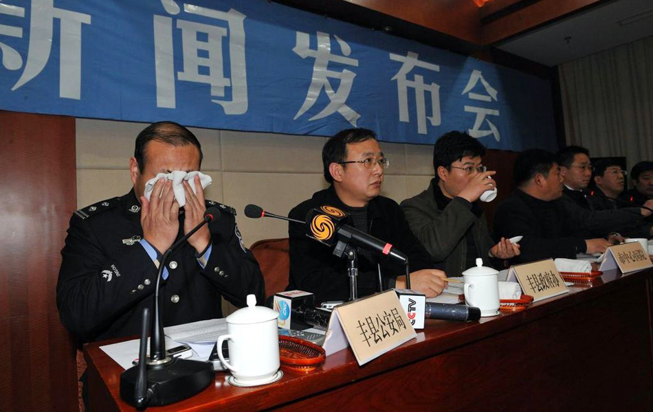 12月14日下午,江苏徐州召开新闻发布会,公布丰县校车事故中八位受伤学生名单。图为江苏丰县公安局副局长在答记者问时谈到事发当天抢救孩子情景时落泪。