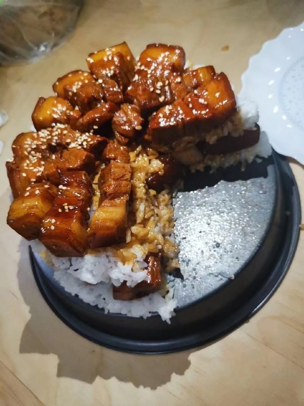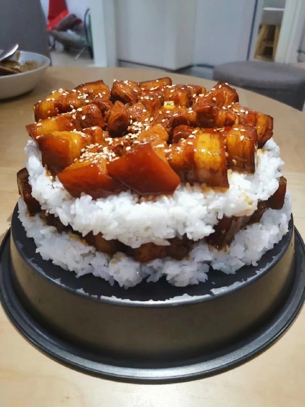中式蛋糕这样吃不够正宗,正确的姿势应该是:先吃一口红烧肉,慢慢咀嚼让肉的芬芳充满整个口腔,然后再吃一口饭,让口腔在充满肉的芬芳之余,增添了米饭的香甜,然后再让红烧肉和米饭的混合物在口腔充分混和、搅拌,再慢慢咽下去。吞下红烧肉和米饭的混合物之后,吃一口青菜(最好应该是菜心),让青菜充分清理干净口腔内的红烧肉和米饭的残留,再开始下一口的红烧肉,又会有一种新的感受了,不那么容易腻。另外再说多一句,做红烧肉不应该放芝麻的,芝麻的香味太浓,反而会影响了红烧肉香浓的味道,芝麻应该用在本来味道不太浓的东西上,比如捞粉上面。