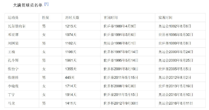 在国内,大家说的比较多的就是乒乓球的大满贯。乒坛大满贯是指:一名球员赢得奥运会、世锦赛、世界杯的单打冠军。图 2 是至今所有获得乒坛大满贯的运动员,除了瓦尔德内尔,其余全是中国选手。