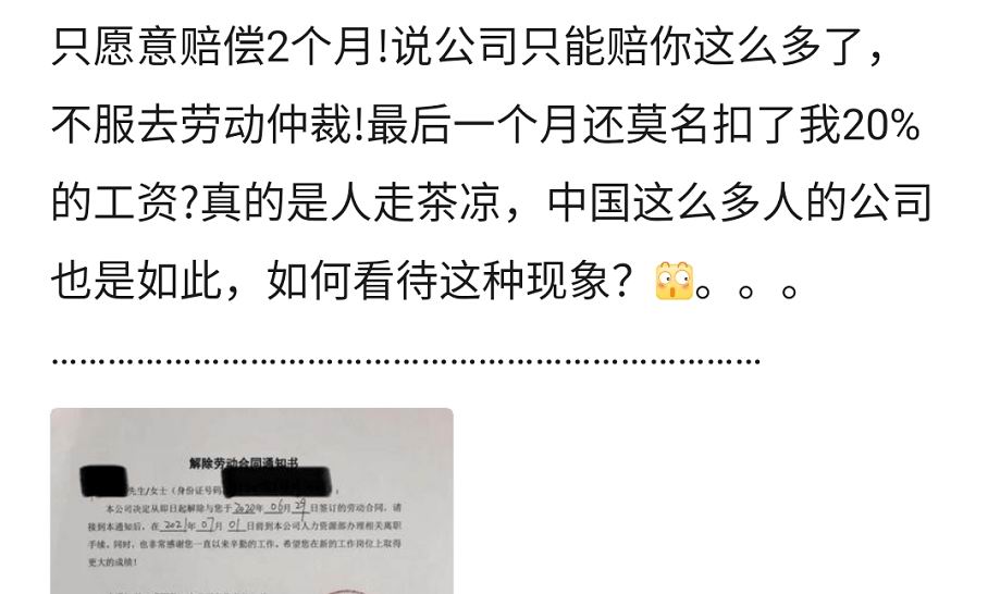 脉脉上,有网友爆料自己的赔偿金只拿到了两个月平均薪资,对方称."公司只能赔你这么多,不服去仲裁"。
