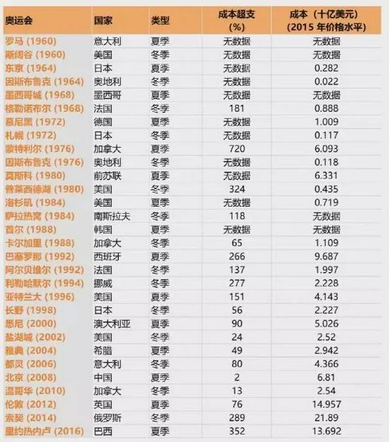 雅典奥运会不是特例。从上表可见,2000 年澳大利亚奥运会超支 90%,2016 年里约热内卢奥运会的超支甚至达到了 352%。
