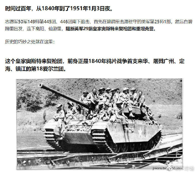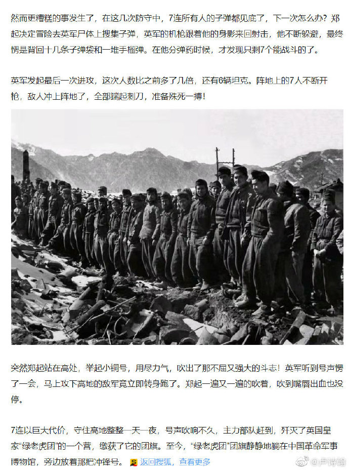 这个皇家奥斯特来复枪团是英军王牌部队,恰好也就是一百年前,1840 鸦片战争时期,来侵略中国的部队,(当时叫爱尔兰步兵团)。阻击的志愿军战士打到只剩下七个人,拼刺刀吹冲锋号,终于等来大部队合围~最后该团虽然突围,但是其第一营被全歼