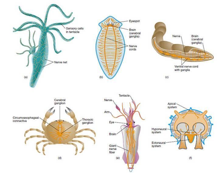 大约在七八亿年前,早期刺胞动物(水母类)出现时,第一次出现了神经系统,但却是网状的。一触而动全身。随着扁形虫的出现,有了梯状神经系统,然后线虫类又合并出了神经节。