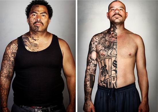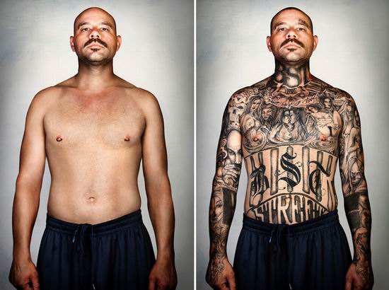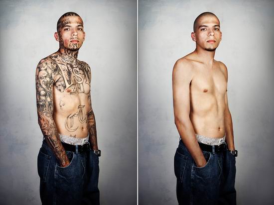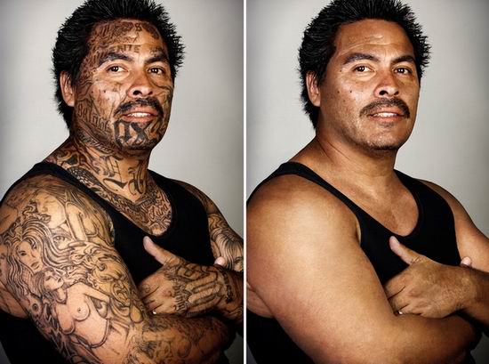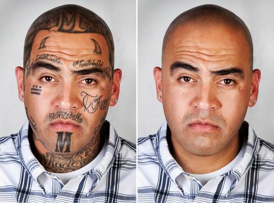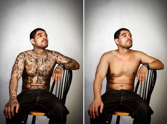 关注到这一现象后,摄影师 Steven Burton 决定开展一个活动:他找来了一些前黑帮成员,利用 ps 为他们 p 掉了身上的纹身,然后给当事人看前后对比照片。
