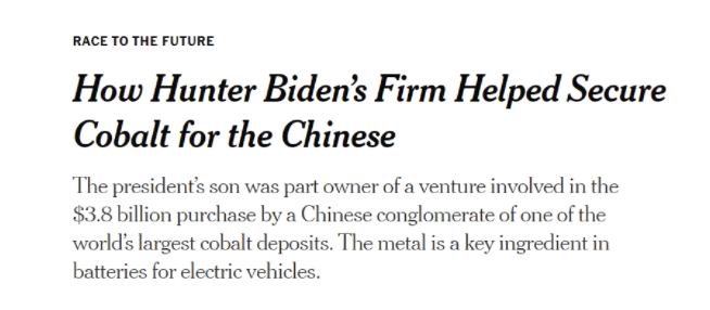 NYT 看起来似乎比美国政府还要急,最近报道了这个事儿之后,还发了另外一篇报道,标题是《 亨特?拜登的公司如何帮助中国人获得钴 》。