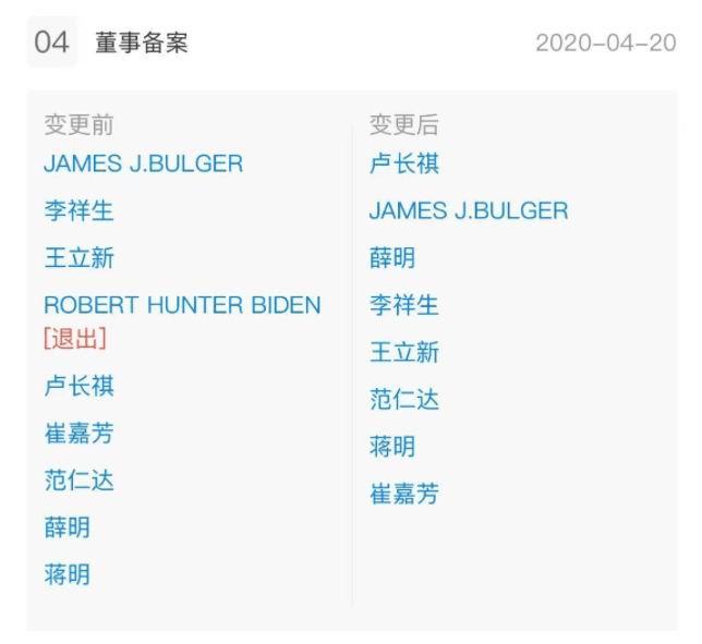 根据天眼查的资料显示,亨特?拜登在 2019 年是渤海华美董事会成员,于 2020 年 4 月 20 日退出,也就是说渤海华美确实和亨特?拜登有关系。