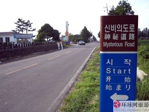 韩国“怪坡”  韩国的济州岛,在天马牧场附近的516国道,有一段“怪坡”,汽车到此,熄火并置于空档,却见汽车又向坡上滑行。