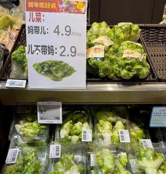 这种标语摆在蔬菜区,看似只是平平无奇的价格标示。但内容往往令人迷惑: