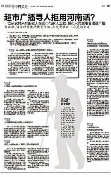 之前曾有这样一个新闻:郑州市的一家超市内,一位老人走丢,其家属要求用老家方言播报,以让走失老人能听懂,但却遭到服务人员的拒绝。