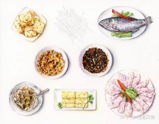▲.水城烙锅及其配菜,下图第一行依次为:臭豆腐、小海鱼;第二行右为蘸水;第三行:冰粉、黄糍粑等。绘画./.林曦.