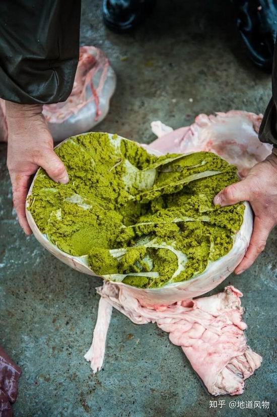 为什么侗族人要吃这么鬼畜的东西?其实是为了胃肠遗留物的消化液,正适合辅助消化侗族人常吃的糯米,也能应对当地的湿热气候。这种源自传统黔东南侗药中的土方."百草汤",久而久之,却成为了粗暴直白,却惊奇无比的地方美食。