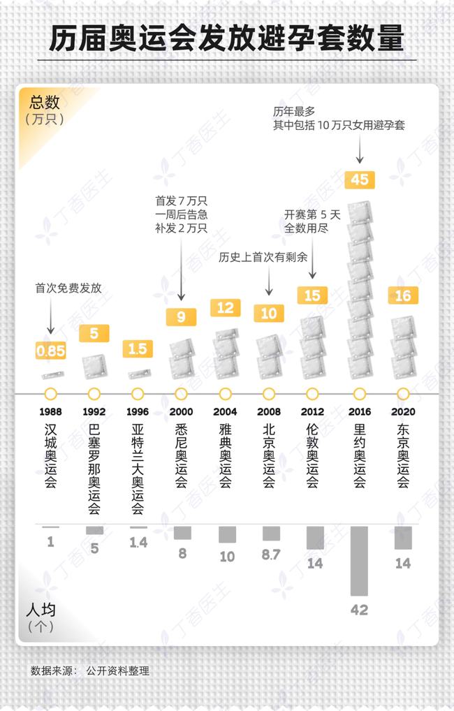 不过,组委会免费发放避孕套的宗旨,从一开始就不止「为大家在紧张的赛程间隙寻欢提供便利」那么简单,尤其是从越来越多的人均领取量来看,奥运避孕套更多是作为纪念品,从奥运村去往了全世界。