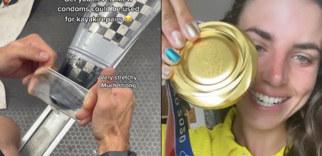 赛前,她的皮划艇意外破损。无奈之际,她想到了避孕套.--.结实、高弹、防水,简直是修复的理想材料,而被套套附体的皮划艇也确实不负所望。