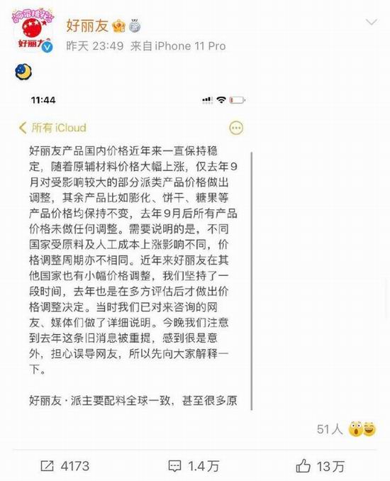 对此,好丽友在官方微博回应称,随着原材料价格大幅上涨,好丽友中国产品仅去年9月对受影响较大的部分派类产品价格做出调整,去年9月后所有产品价格未做任何调整。而好丽友·派的主要配料是全球一致的,不存在“双标”问题,是由于翻译软件在翻译海外配料表时表述不精准,加之各国对配料表的要求、称呼都不一样,所以导致网友产生了误会。