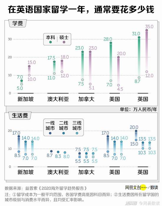 根据益普索在.2020.年做的调查,在热门的留学国家中,英美的学费、生活费都相对较高,基本.1.年打底就要.15.万起步,花四五十万的留学生也不是没有。