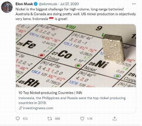 马斯克凌晨发推表示 “镍是锂电池续航的最大挑战”