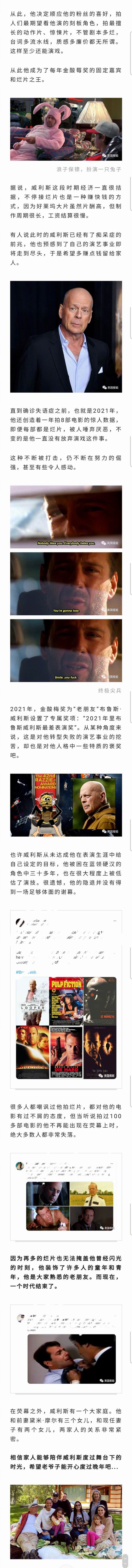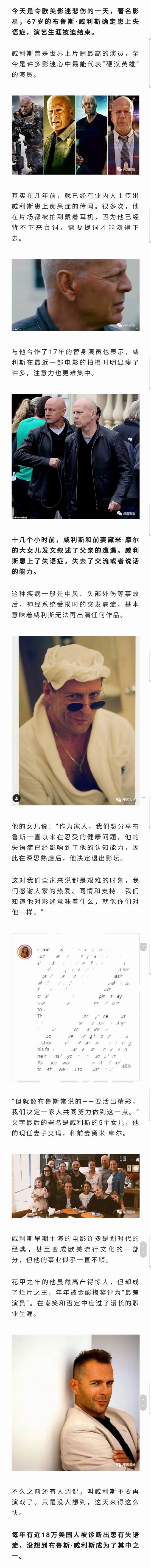 好莱坞老牌演员布鲁斯。威利斯因患上失语症,被迫息影
