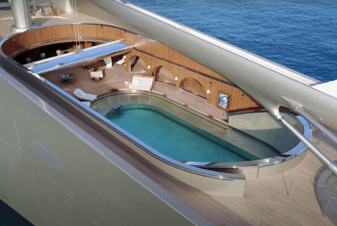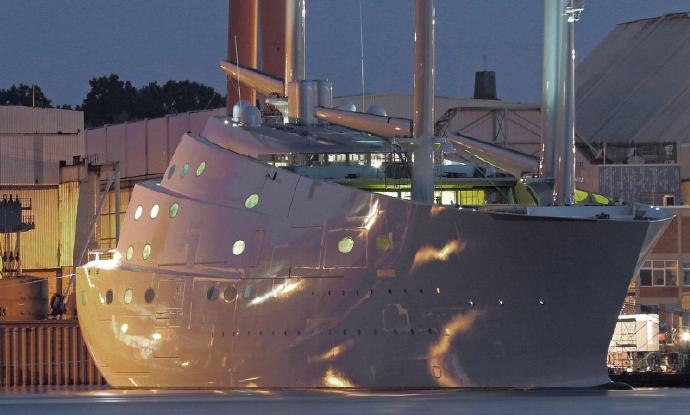 意大利扣押俄罗斯富豪梅利尼琴科的游艇,“风帆游艇 A”。确实是条很漂亮的船。设计者是法国工业设计师菲利普・斯塔克。排水量 12558 吨,全长 142.81 米,机帆混合动力,最高速度 21 节,船员 54 人。世界最大的私人机帆游艇。末尾图是船底安装的独立观景舱。