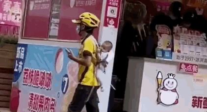 他时不时地盯着手机的送餐信息,身后还背着一个年幼的孩子。