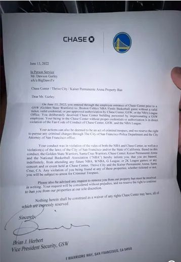 不过,他的代价也很惨重,他被现场发觉是冒充后立即被驱逐出场,而且勇士之后发表声明宣布对他终身禁赛,不准他踏入大通中心球场。