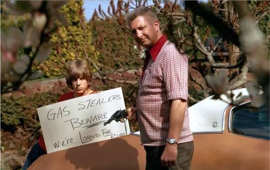 石油危机期间,司机持枪警告,“偷汽油的人会受到惩罚”