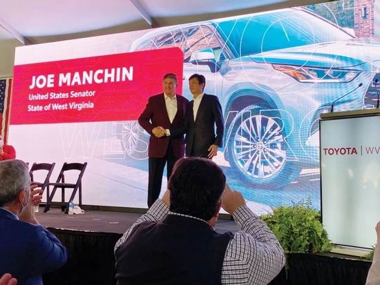曼钦 (左)反对税收优惠后,与丰田北美区总裁小川哲夫同框
